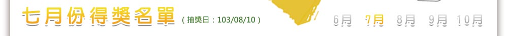 iPad Air得獎人,請您於103/9/19 前寄回得獎專函。若逾期回覆將視同放棄領取獎品權益。 |
