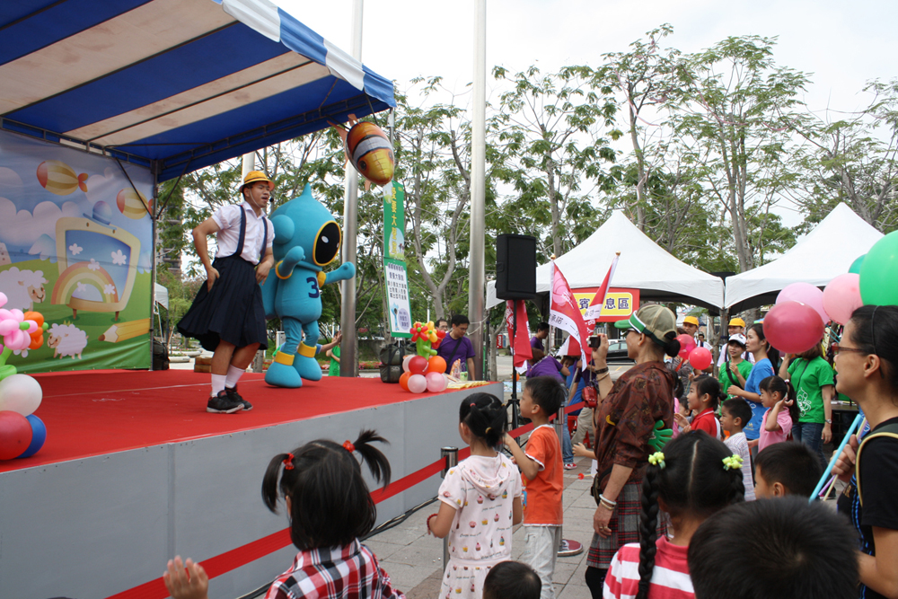 「跟著我拍拍手」,台上的小丑表演與小朋友熱情互動,展現天真活潑的純真面,溫馨的親子互動,充斥在夢時代購物中心廣場的各個角落,草地上、斜坡上,小朋友們認真彩繪出自己心目中的藍圖,用畫筆繪出獨特詮釋的美麗語言。