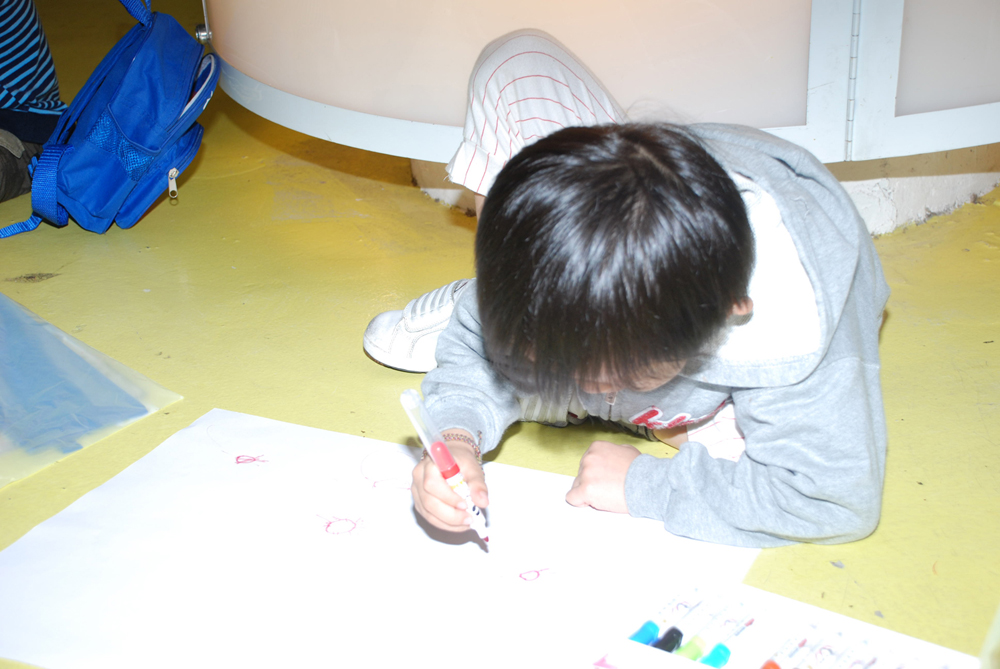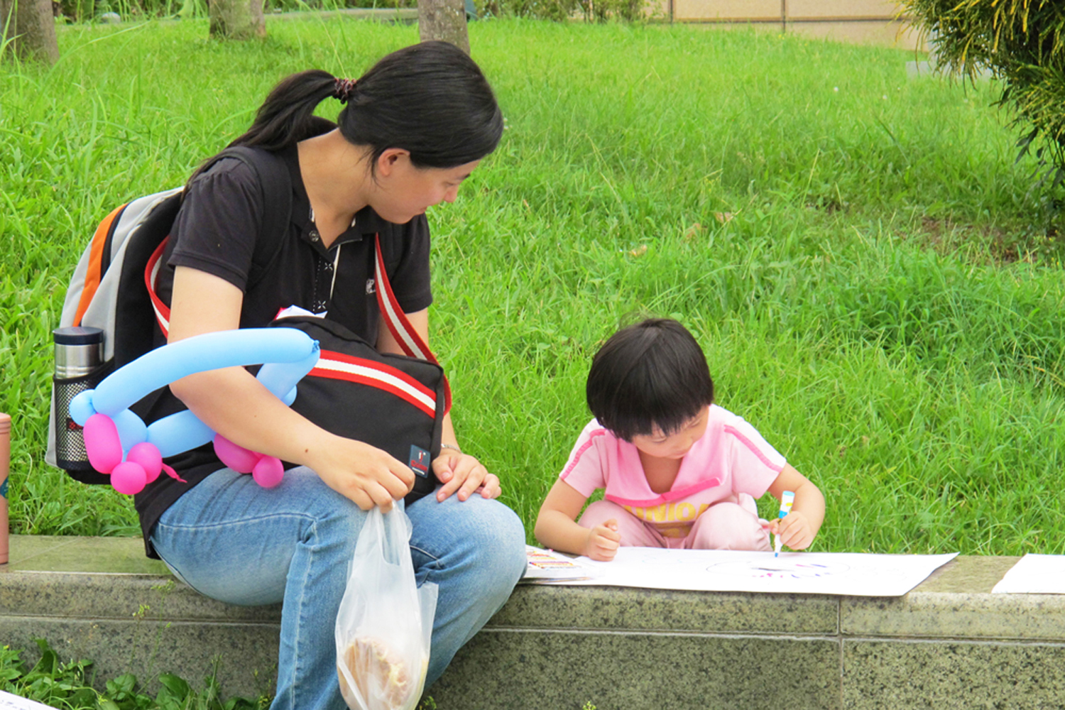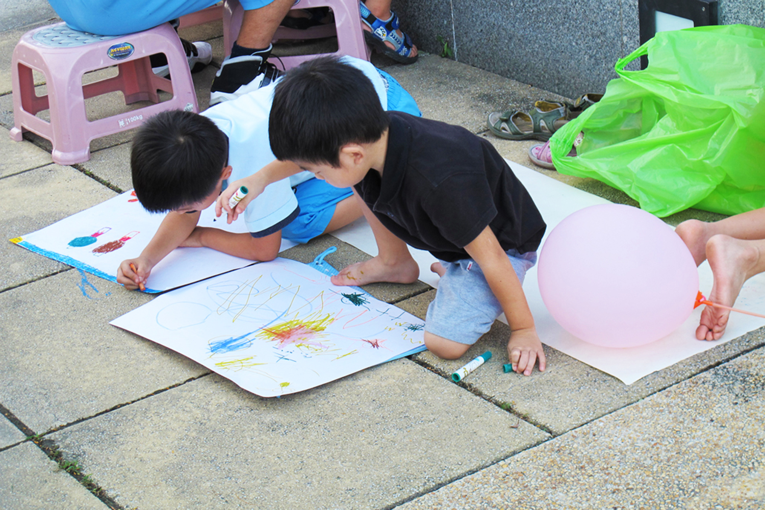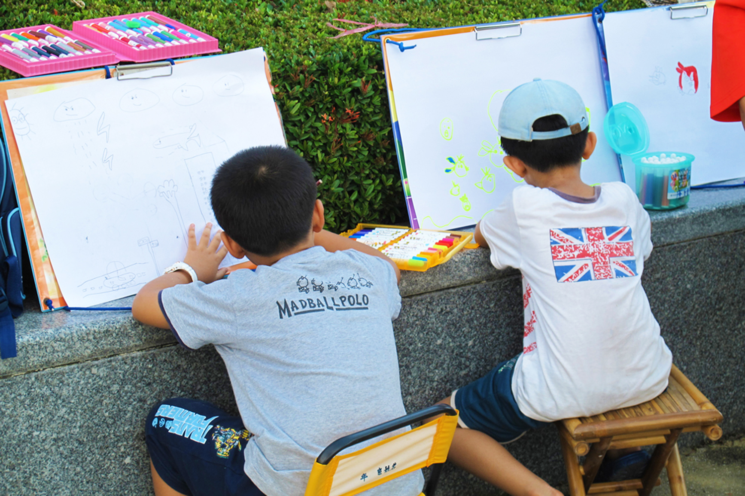 活動當日天公不作美,不過還好花博爭艷館有個大屋簷,讓小朋友可以安心作畫、親子開心參與攤位闖關活動。小朋友或坐或臥,甚至即興以雨景作為畫作繪畫的主題,由此見識到小朋友的創意跟聯想力無遠弗屆。