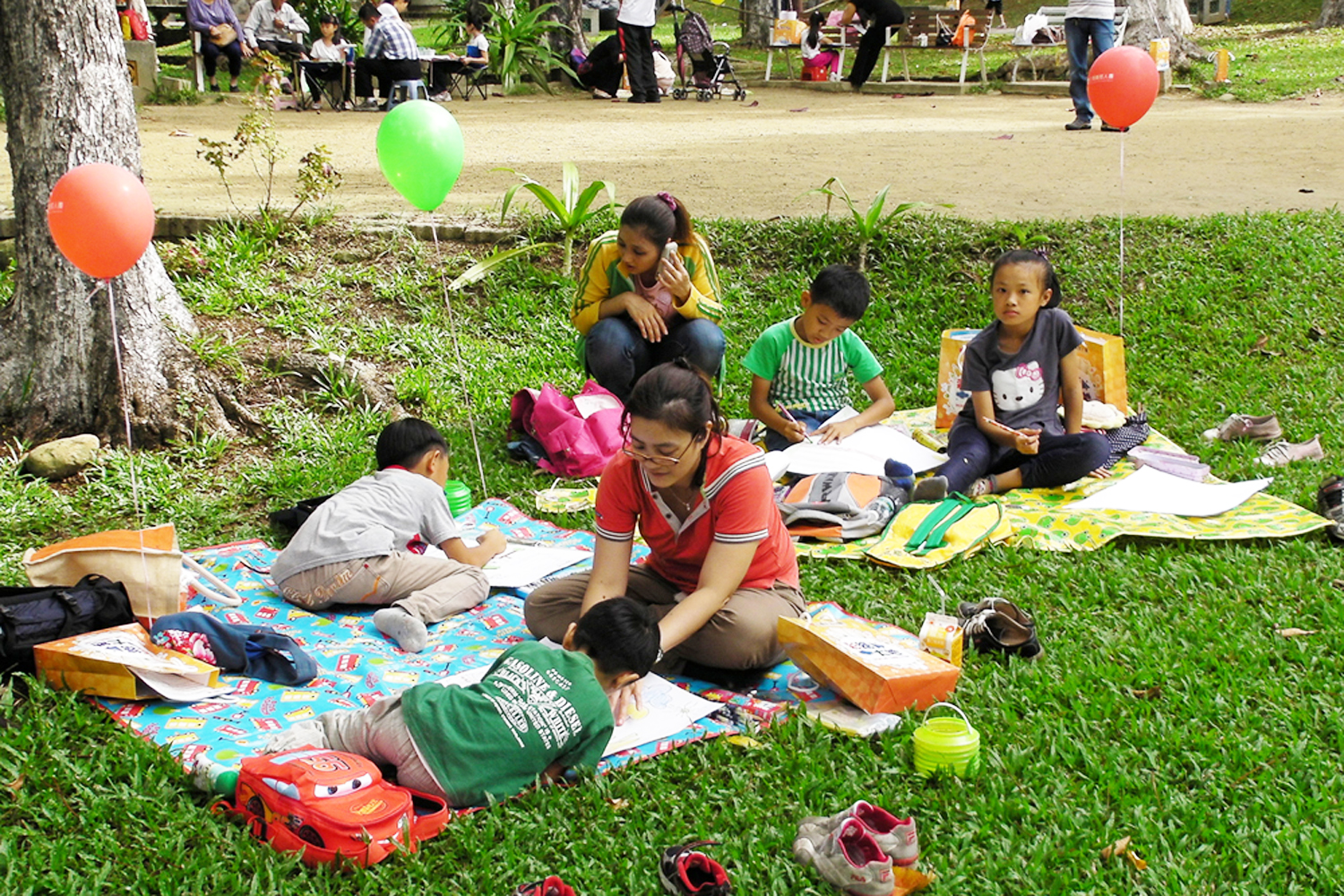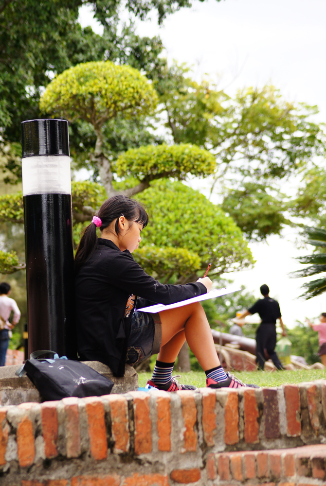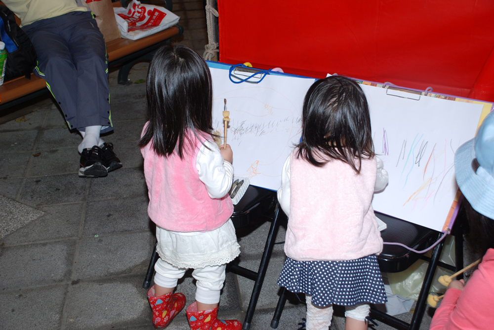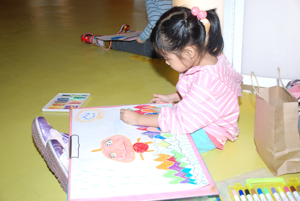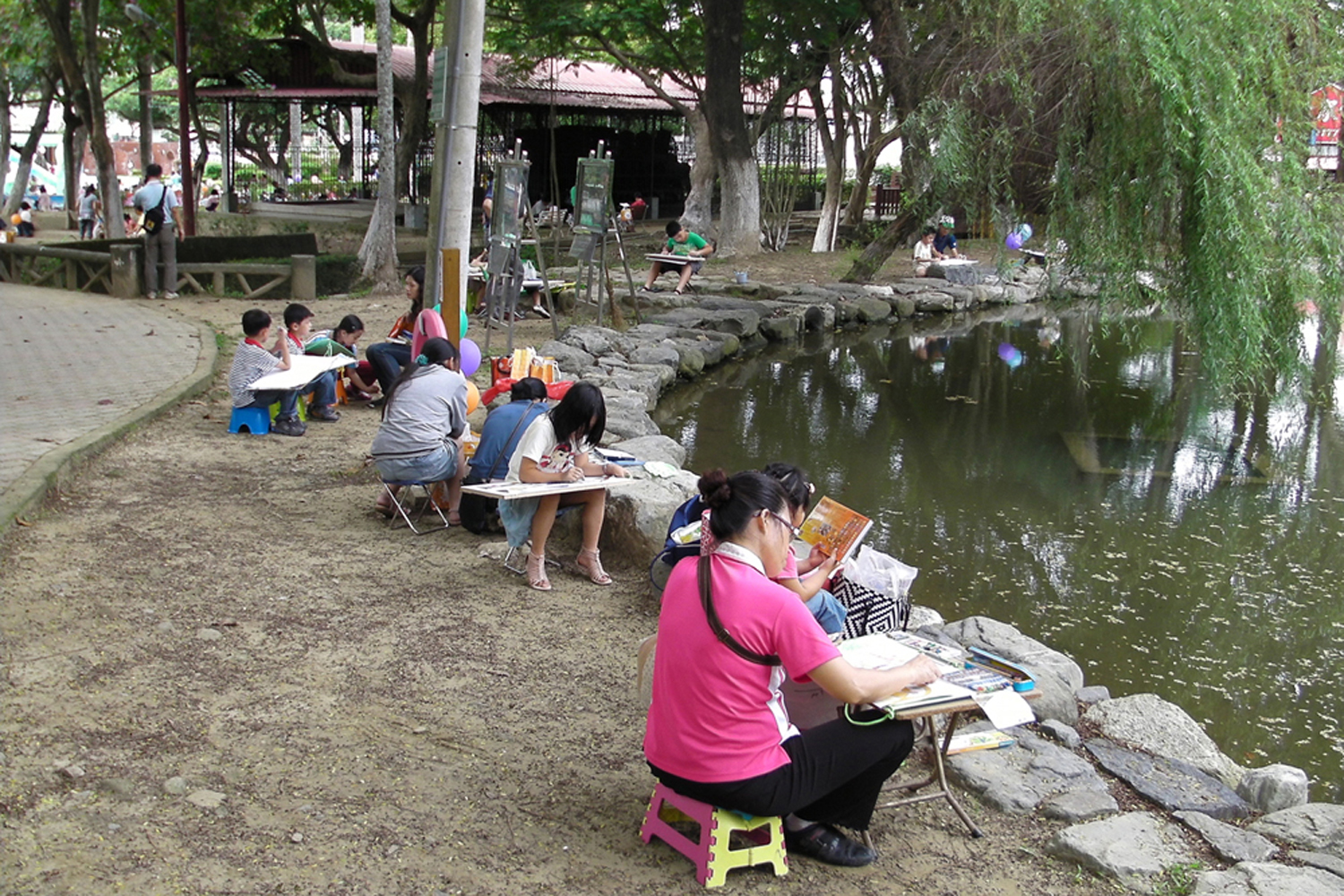 活動當日天公不作美,不過還好花博爭艷館有個大屋簷,讓小朋友可以安心作畫、親子開心參與攤位闖關活動。小朋友或坐或臥,甚至即興以雨景作為畫作繪畫的主題,由此見識到小朋友的創意跟聯想力無遠弗屆。
