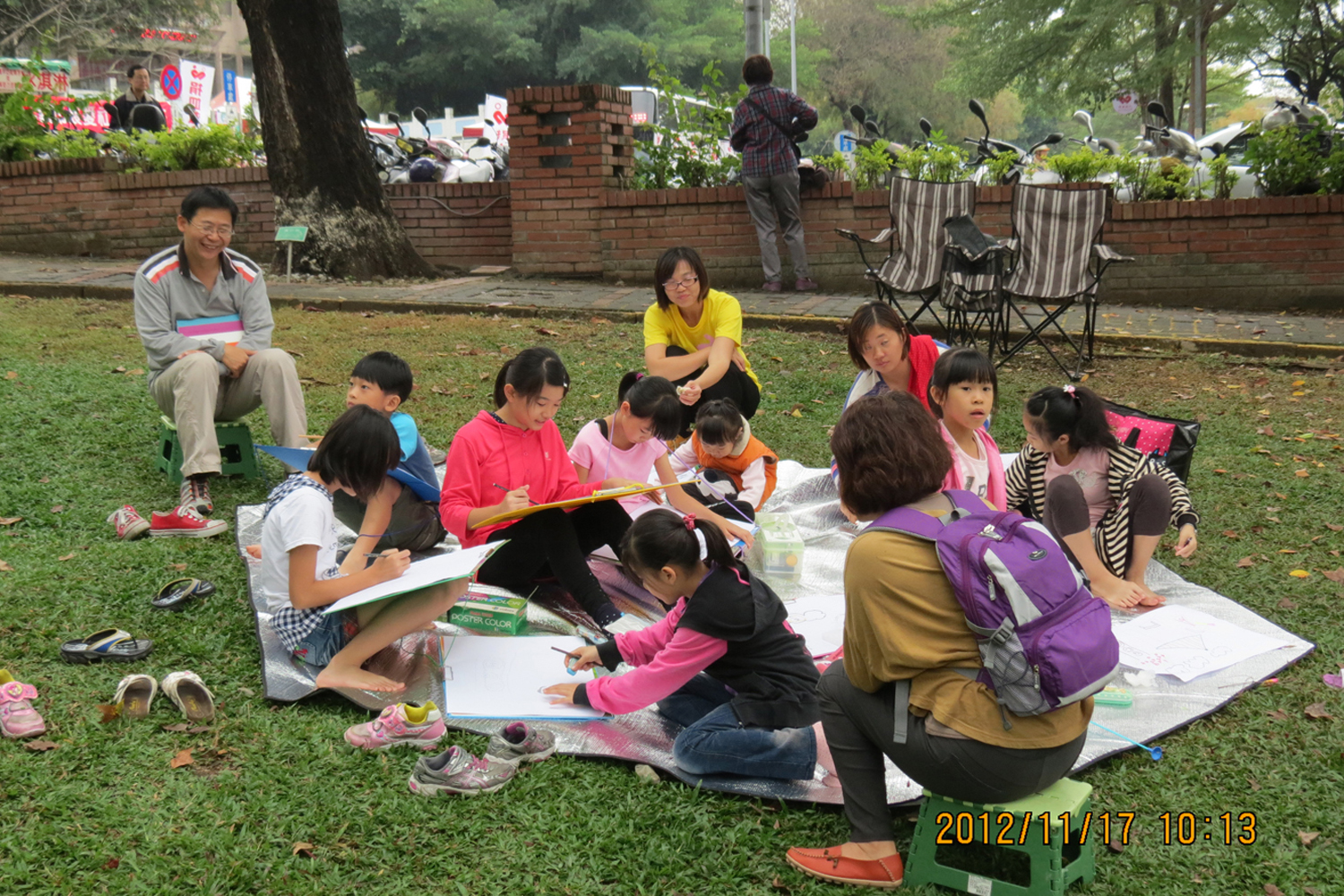 大家席地而坐,認真的描繪著公園裡的一草一木。