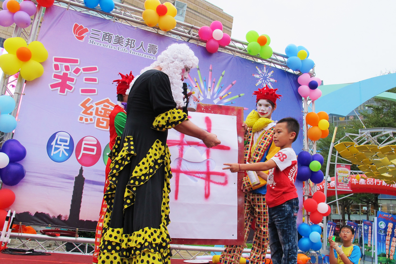 小丑與小朋友互動玩遊戲,大家都想要上來同樂呢!