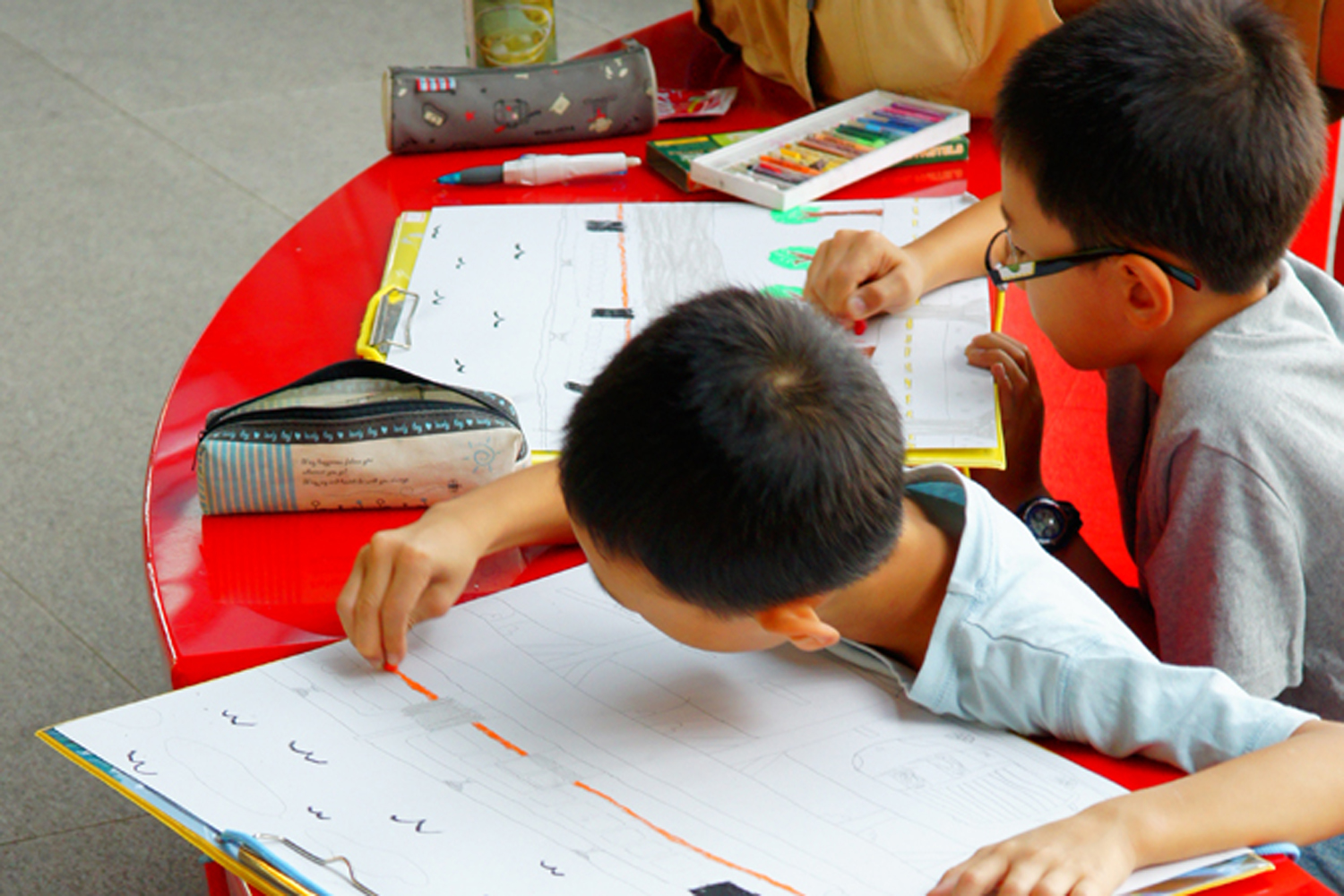 小朋友認真繪圖,畫下對高鐵站的繽紛想像。