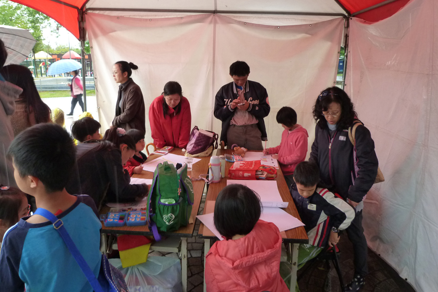 外頭下著雨,絲毫不減小朋友在帳篷裡認真作畫的興致。